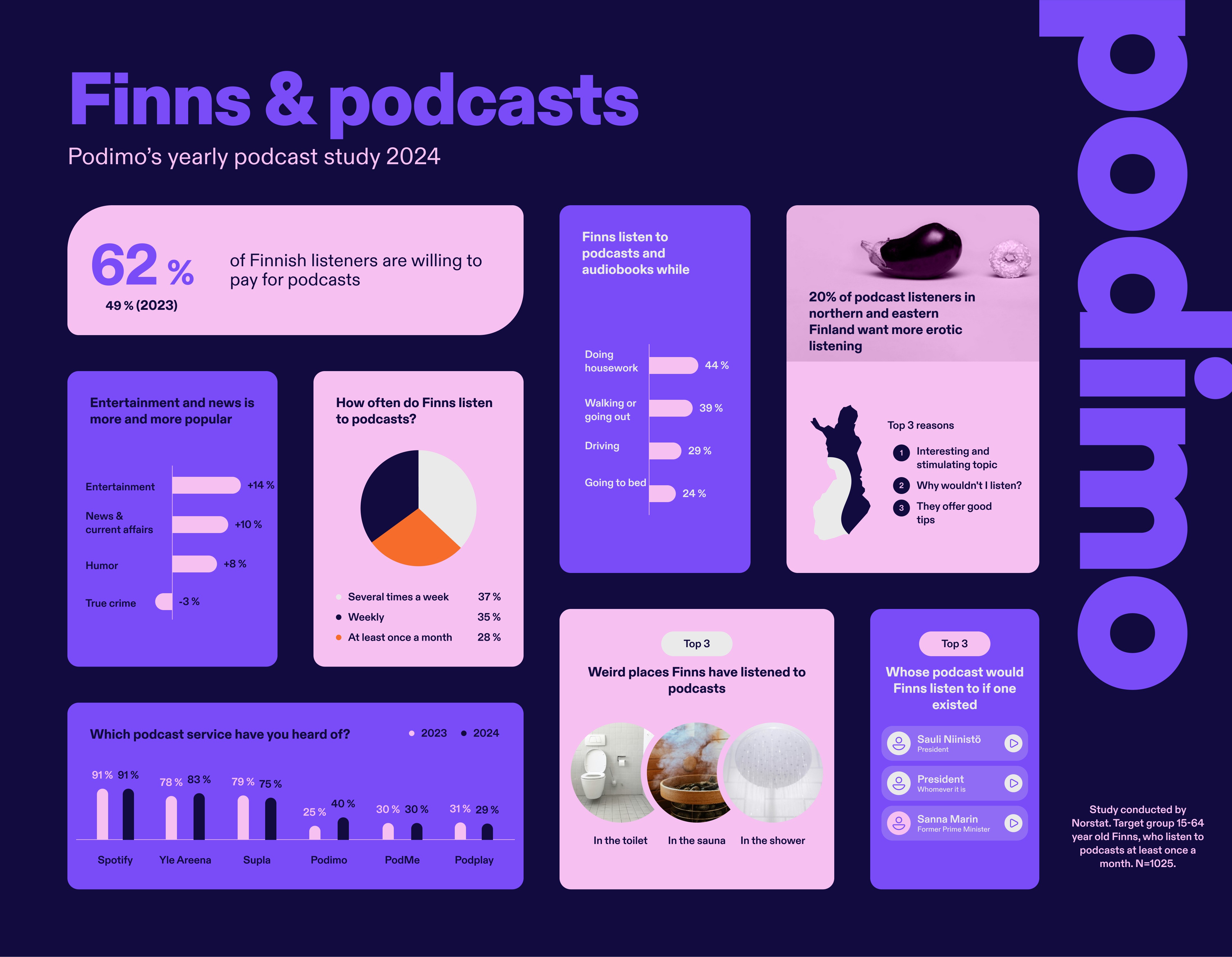 En la encuesta anual de comportamiento de podcast en Finlandia, encargada por el servicio de podcast y audiolibros Podimo, se preguntó a los finlandeses que escuchan podcasts al menos una vez al mes sobre sus hábitos de consumo de podcast. En febrero de 2024, 1,025 finlandeses de entre 15 y 64 años de todo el país respondieron a una encuesta realizada por Norstat para Podimo.